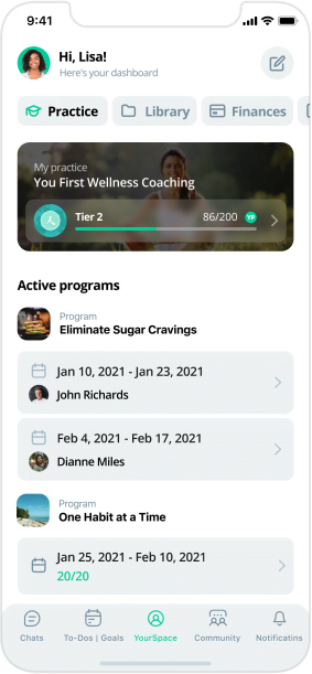Our pricing model is built on this principle, gamified to decrease your subscription price with every new client you coach on the platform. In this way, we’re motivating coaches to continue spreading the power of health coaching worldwide and encouraging them to acquire more meaningful client experiences by expanding their practice on our platform.